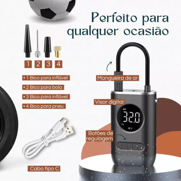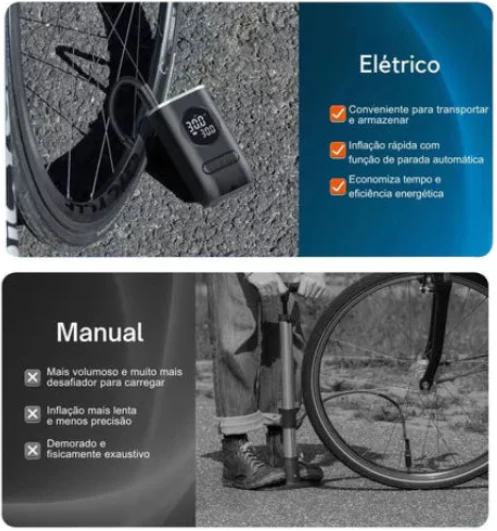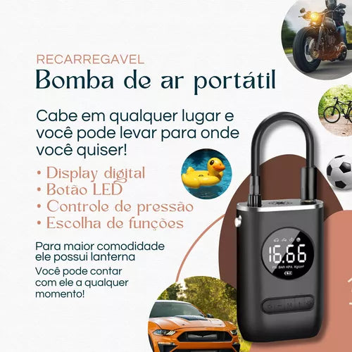 Chega de adivinhações! O Air Max vem com uma tela digital com controle de pressão, que permite ajustar exatamente o nível desejado. E o melhor: ele desliga automaticamente quando atinge a pressão ideal. Simples, seguro e eficiente!