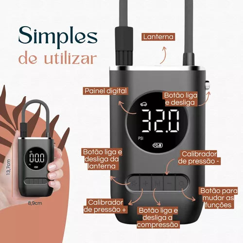 O Compressor Portátil foi projetado para ser fácil de usar, mesmo para quem não tem experiência com ferramentas. Basta conectá-lo à válvula do pneu, ajustar a pressão desejada na tela digital e deixar que o compressor faça o trabalho. Ele desliga automaticamente quando a pressão ideal é atingida, evitando o risco de sobrecarregar o pneu.