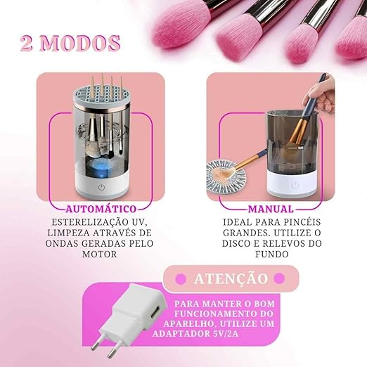 Utilização: Basta adicionar água e sabão neutro no recipiente, mergulhar o pincel no líquido enquanto estiver preso na tampa e ligar o aparelho. Em questão de segundos, seus pincéis estarão limpos e prontos para uso novamente.