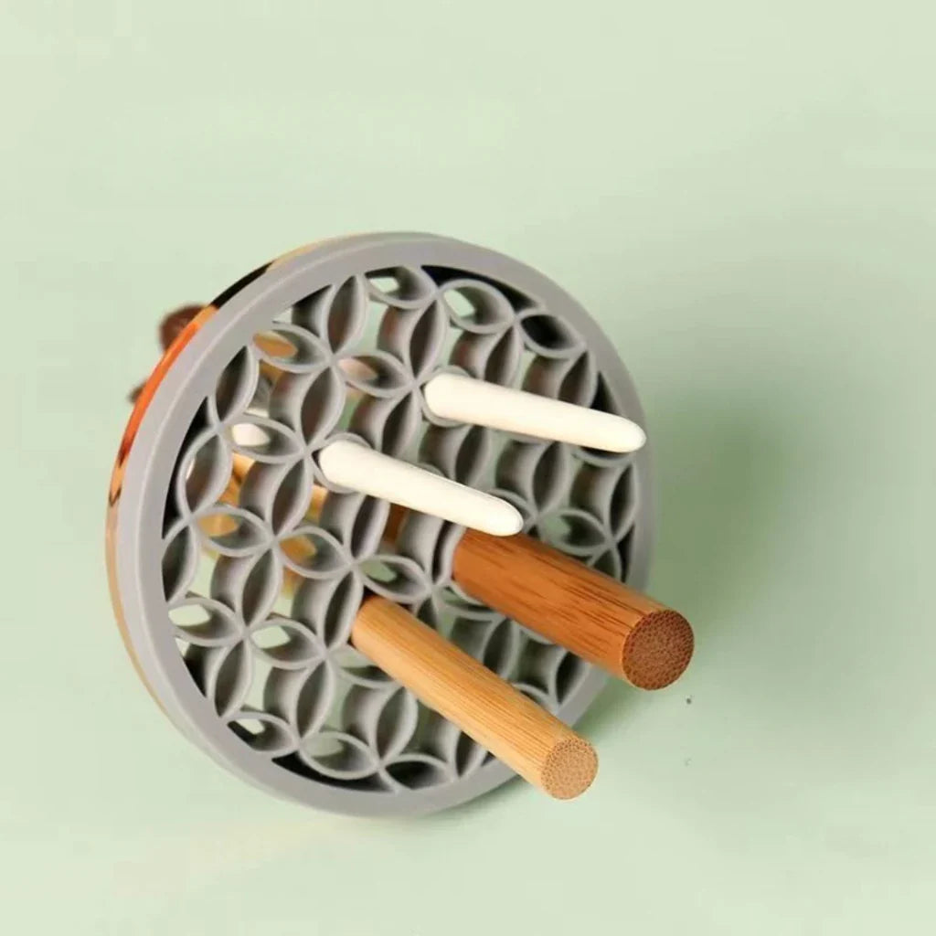 O Limpador possui em sua base tiras de silicone antiderrapantes e sua capa possui um padrão que suporta vários tamanhos e modelos de pincéis.